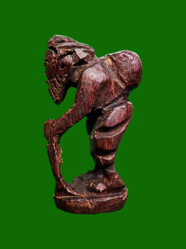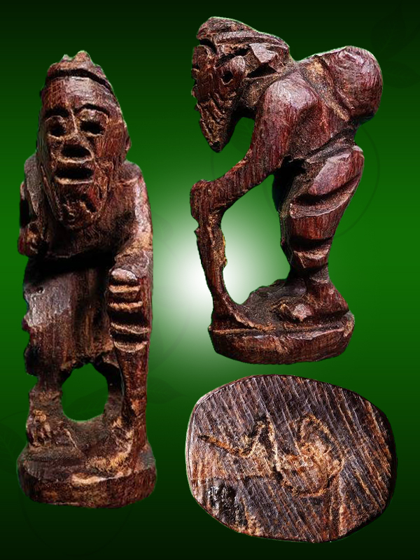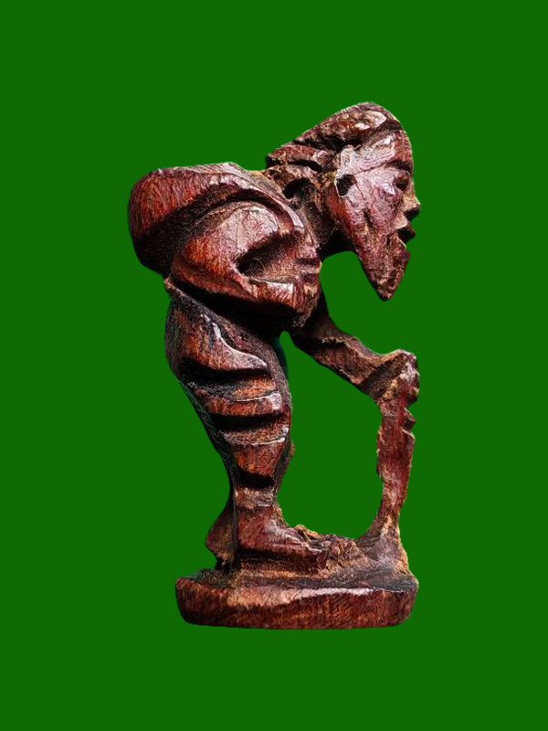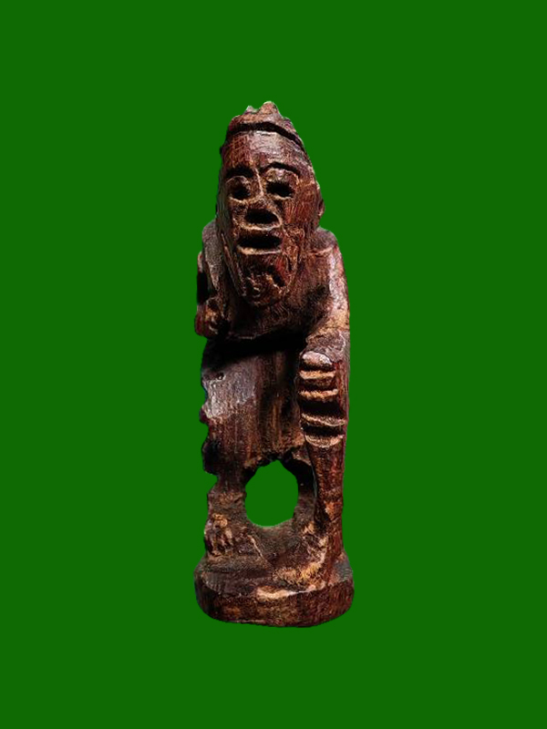 - Form: Standing Chuchok (one-legged posture), holding a crooked walking staff for support (mai phayung), other hand holding a money bag or sack of wealth