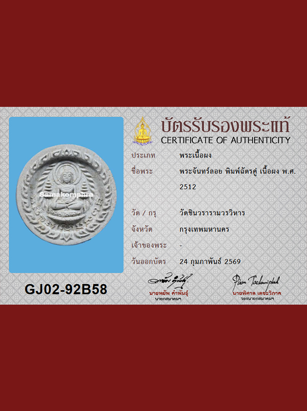 Phra Phong Pim Chan Loy (also known as Phra Phong Chan Loy) of Wat Chinoros is a round-shaped powder amulet in the “floating moon” style (approximately 3.5 cm in diameter). It was created in B.E. 2512 at Wat Chinorosaram Worawihan (Wat Chinoros), Ban Chang Lo Sub-district, Bang Khun Thian District, Bangkok.