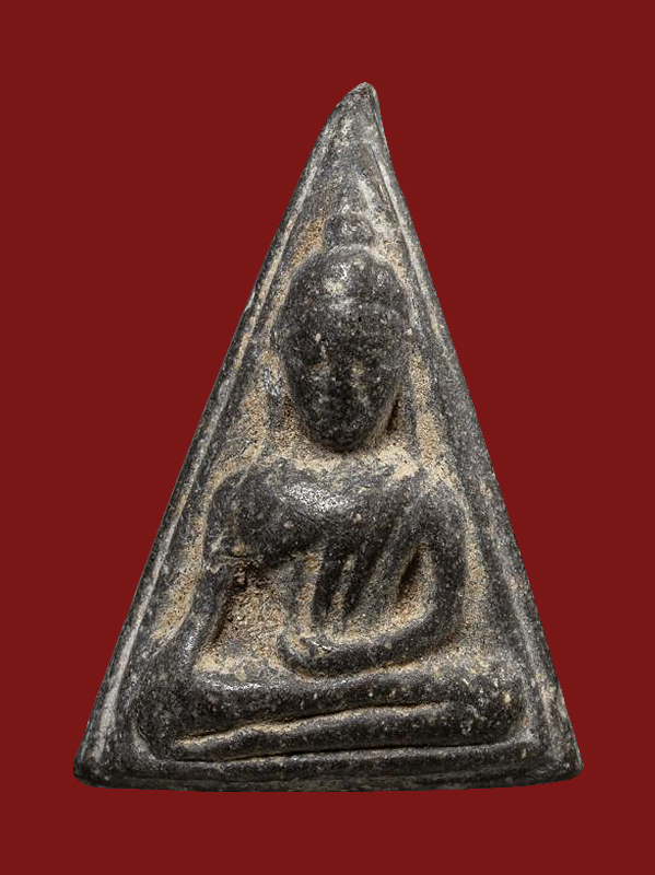 Luang Pho Kway personally created and produced the amulets. The size is approximately 3.2 × 2.5 cm, suitable for casing and wearing around the neck. There are several molds such as large mold, small mold, base-line mold, big-head mold, pillow-base mold, and standard mold (seated Buddha with hands touching knees). Some pieces have a yantra on the back, some have a plain back, and some show fingerprint marks from pressing the mold.